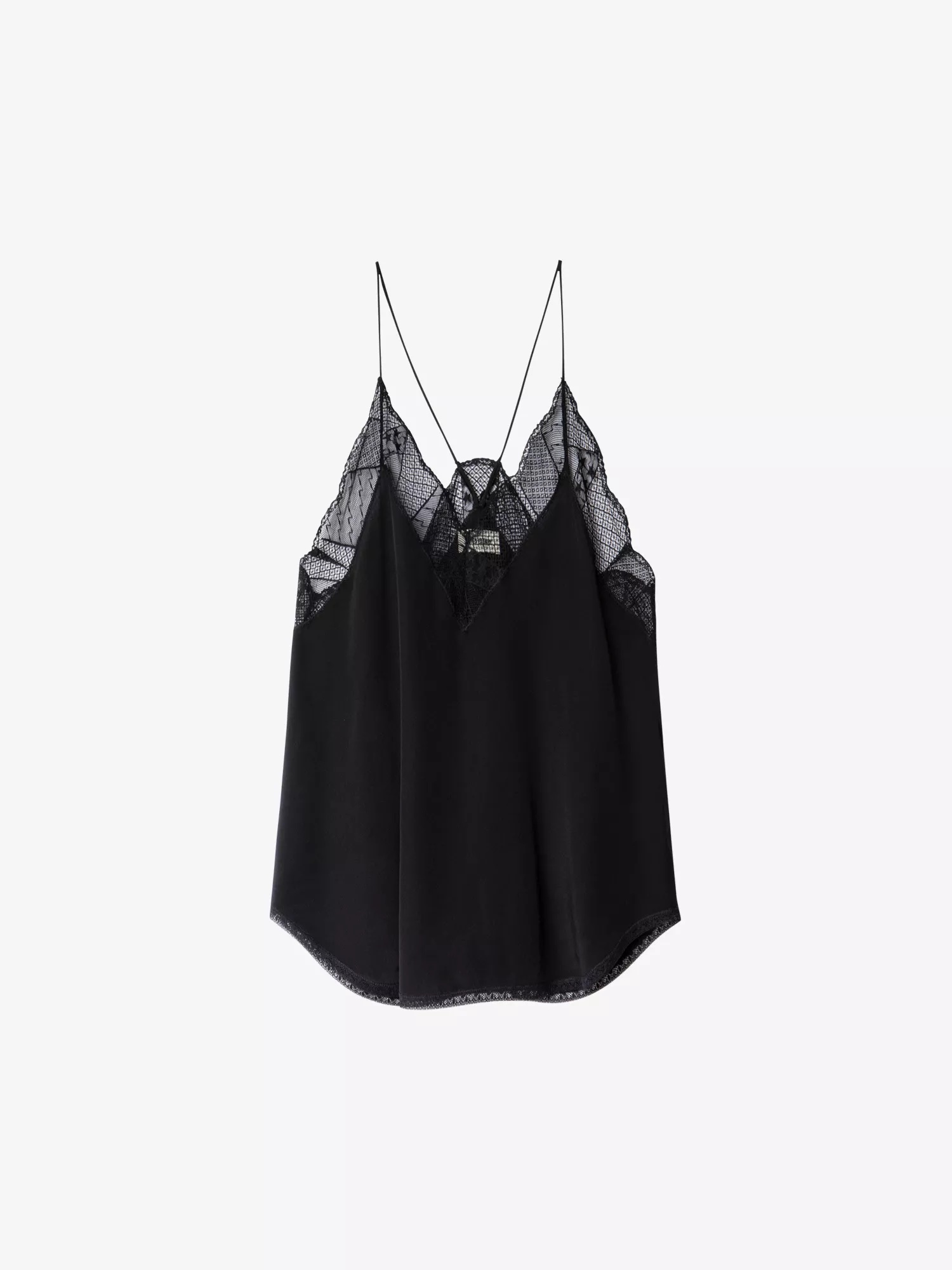 - V-neck, sleeveless, thin shoulder straps, scalloped lace trims, straight hem